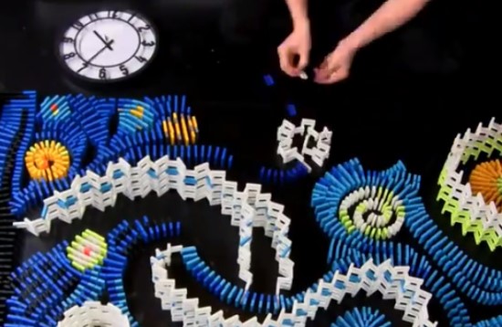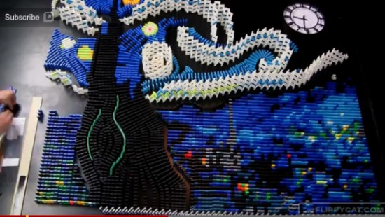 Flippy Cat完成这件作品的过程也经历了失败,是经过两次尝试之后,才最终完成这一杰作的,第一次是因为一颗螺丝脱落,导致没能将所有的多米诺骨牌放倒。经过调试后,他最终成功的将这件作品完成。当他的手指触动第一块骨牌,一个神奇的景象就在人们的眼前发生了,为了这一刻,艺术家一共准备了11个小时。