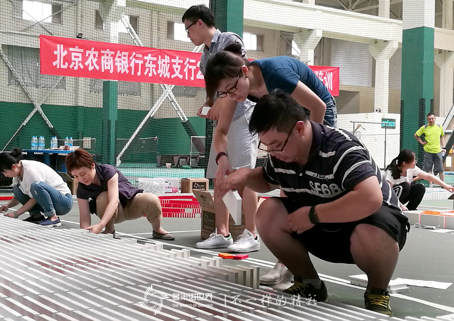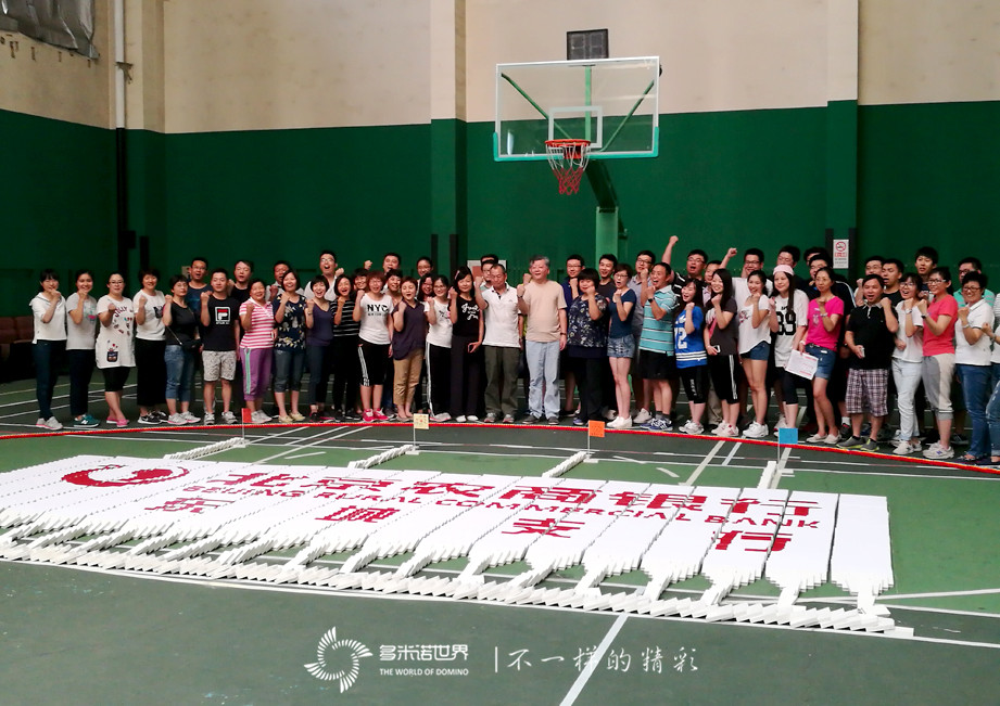 随后的团体挑战项目,四支队伍共同完成了一幅多米诺画卷,画卷上既有代表四支队伍的四色小人,又有“厚德、益众、善行、致远”的企业精神,还有寓意着团结、力量的拳头图案,在一道靓丽的彩虹下,巨幅的北京农商行东城支行LOGO画面,憧憬着北京农商行彩虹般美好的未来。