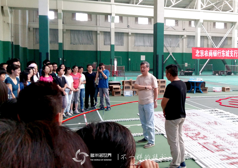 在骨牌最后连接过程中,作为本次活动启动嘉宾的东城支行领导,也被多米诺运动的魅力所吸引,亲自上阵,同队员们一起完成最后的骨牌码放工作。当队员们看到平日的领导在和大家一起“战斗”,并将最后一枚骨牌成功码放时,掌声随之响起。