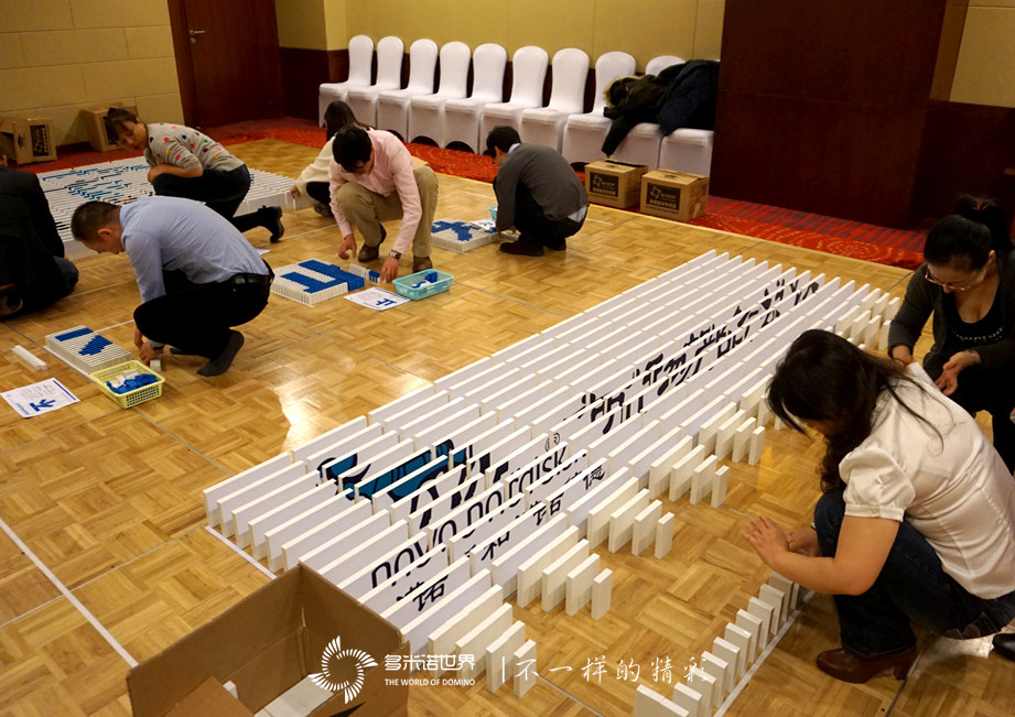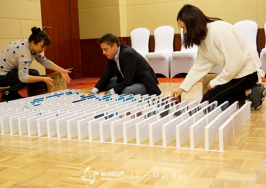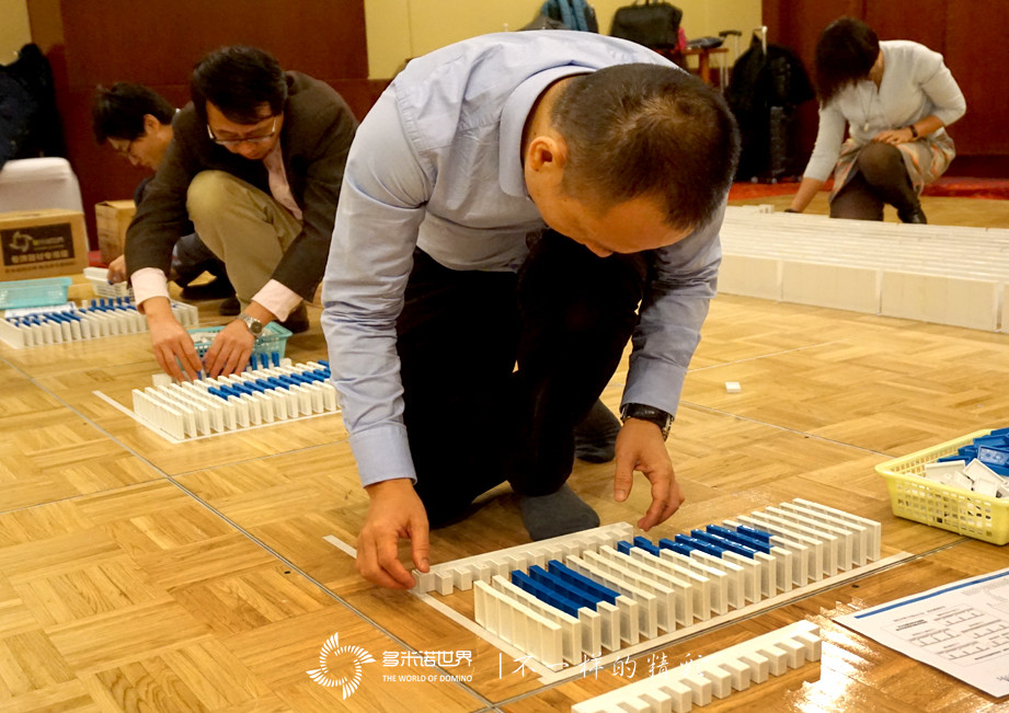 认真听完多米诺世界王磊老师的讲解后,9人团队立即投入到骨牌码放过程中。时间在一枚枚骨牌竖立的过程中一点点流逝,大家也渐渐掌握了骨牌的码放技巧,虽然中途不免会有意外发生,但“从头再来”的精神和细致认真的态度,最终支持团队完成了所有骨牌的码放。