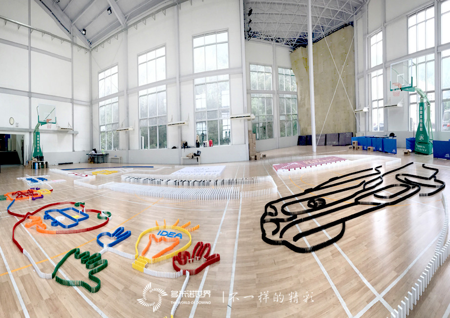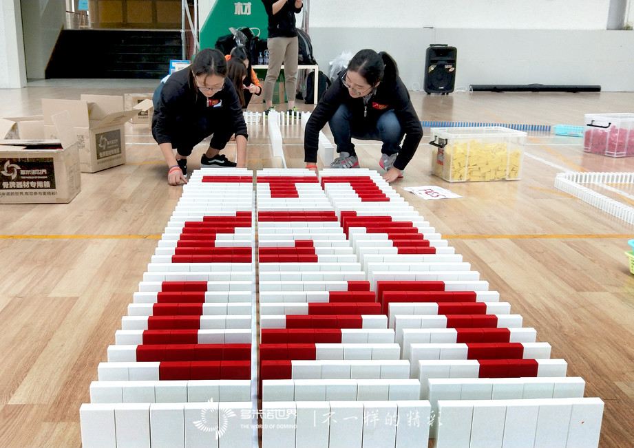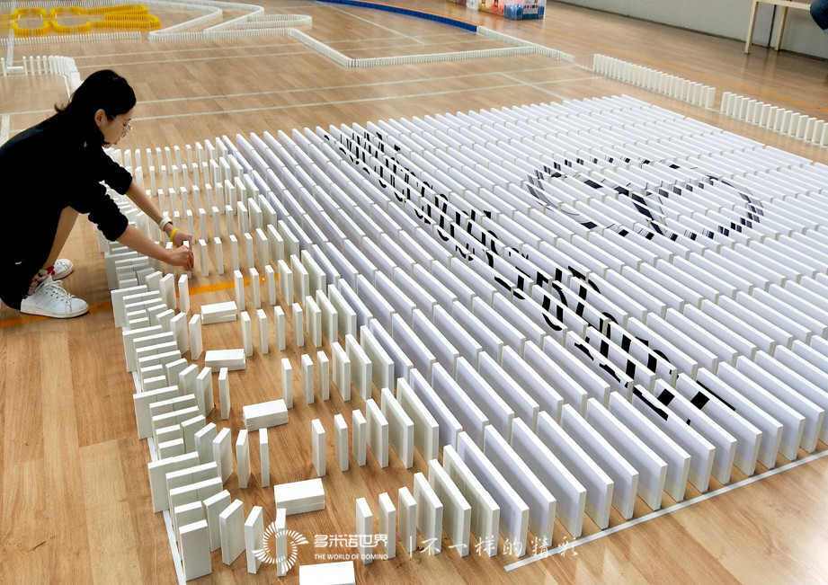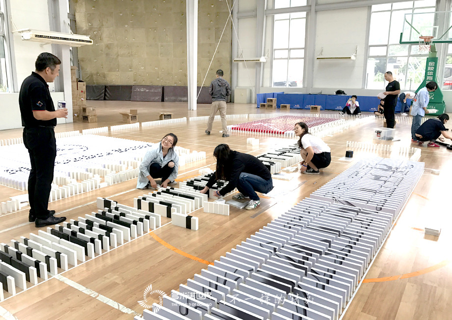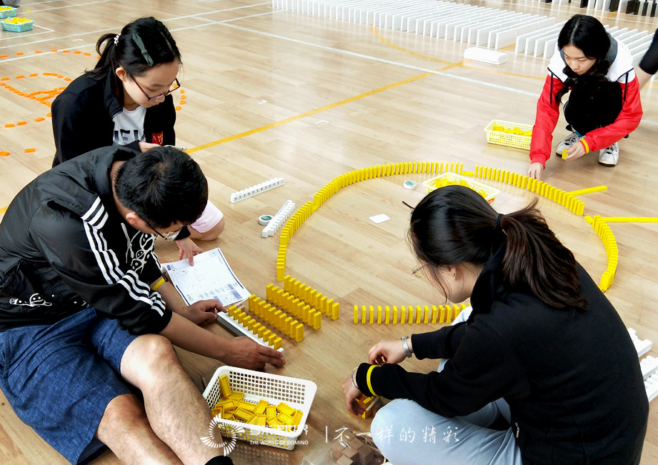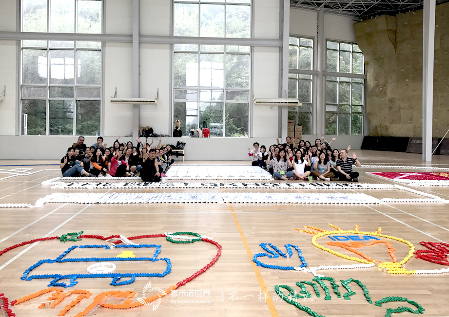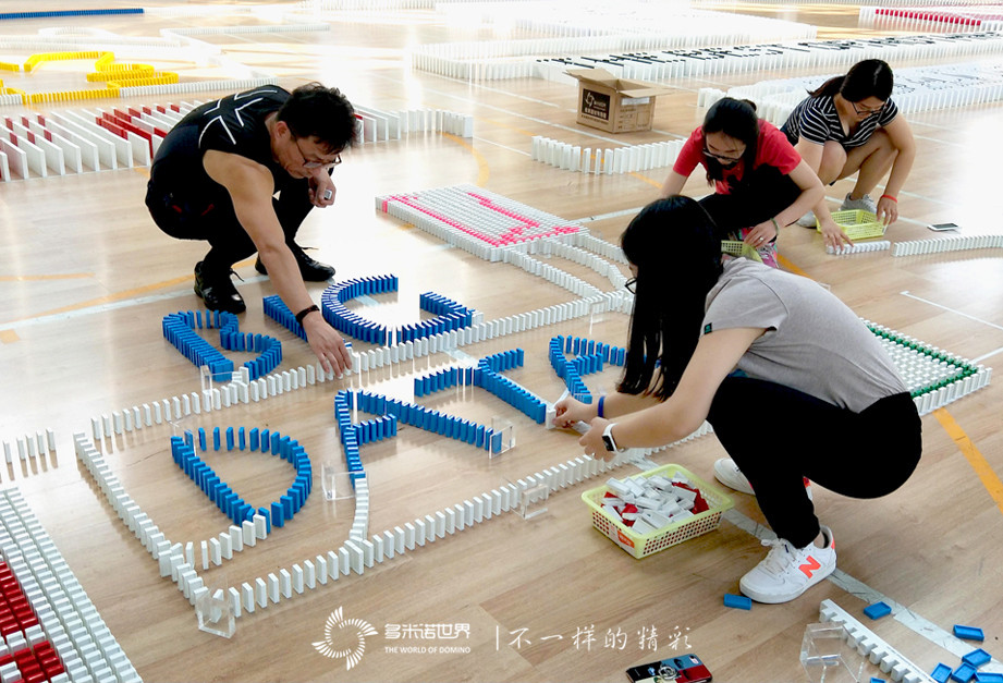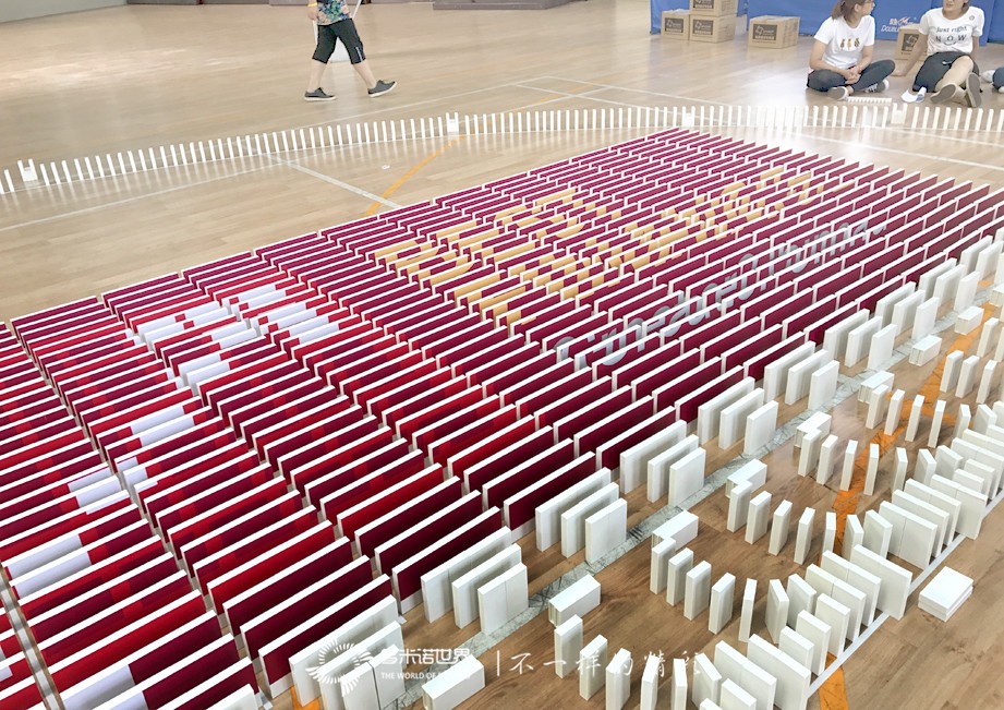 与此同时,多米诺创意区的队员们,为了设计方案绞尽脑汁,把文字变成生动的多米诺图案,既要主题明确,又要图案美观,还要用骨牌码放、呈现,对于第一次参与多米诺活动的队员们来说实则不易。最终,团队力量战胜了经验不足,四幅各具特色的创意多米诺图案纷纷展现在大家面前。