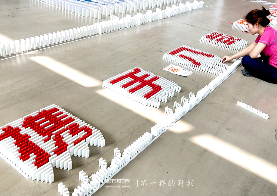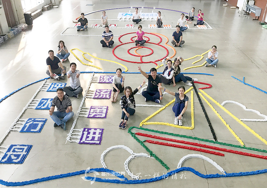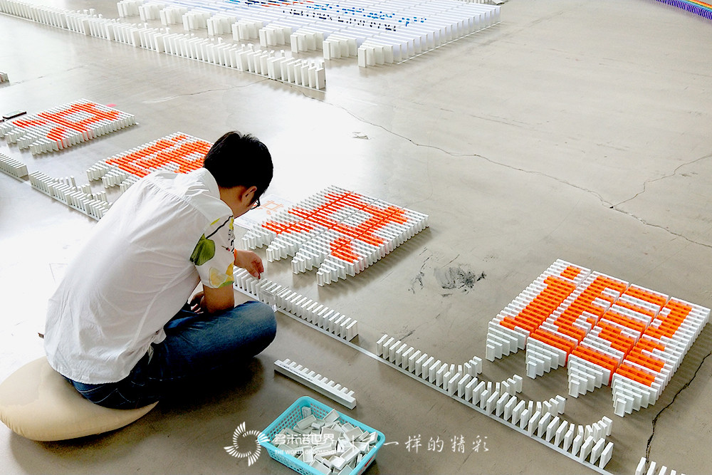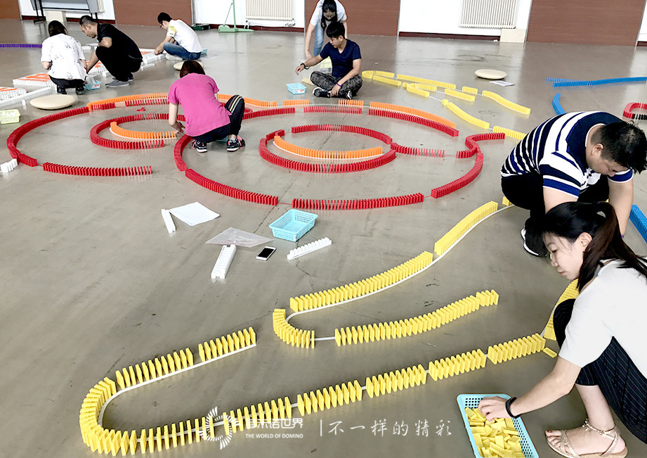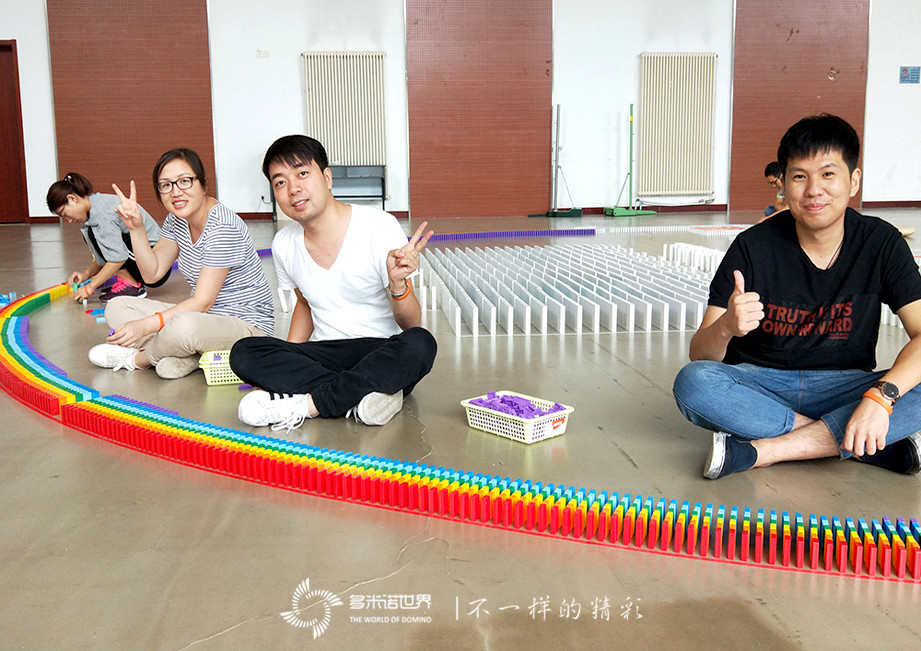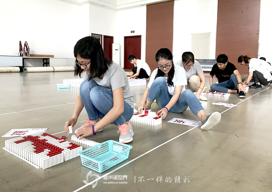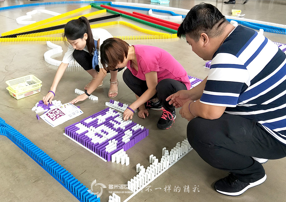 在骨牌码放过程中,大家严格按要求控制骨牌间距,仔细照图纸码放每一幅图案,虽然偶有意外发生,却没有听到队员间的半句埋怨,而是同心协力、从头再来,展现了良好的团队风貌。超大的任务量,不但没有给队员们带来压力,还成为了大家永不停歇的动力,每位完成任务的队员不是马上找到队长再领取下一个任务,就是主动来到还在码放骨牌的队员身边“协同作战”。