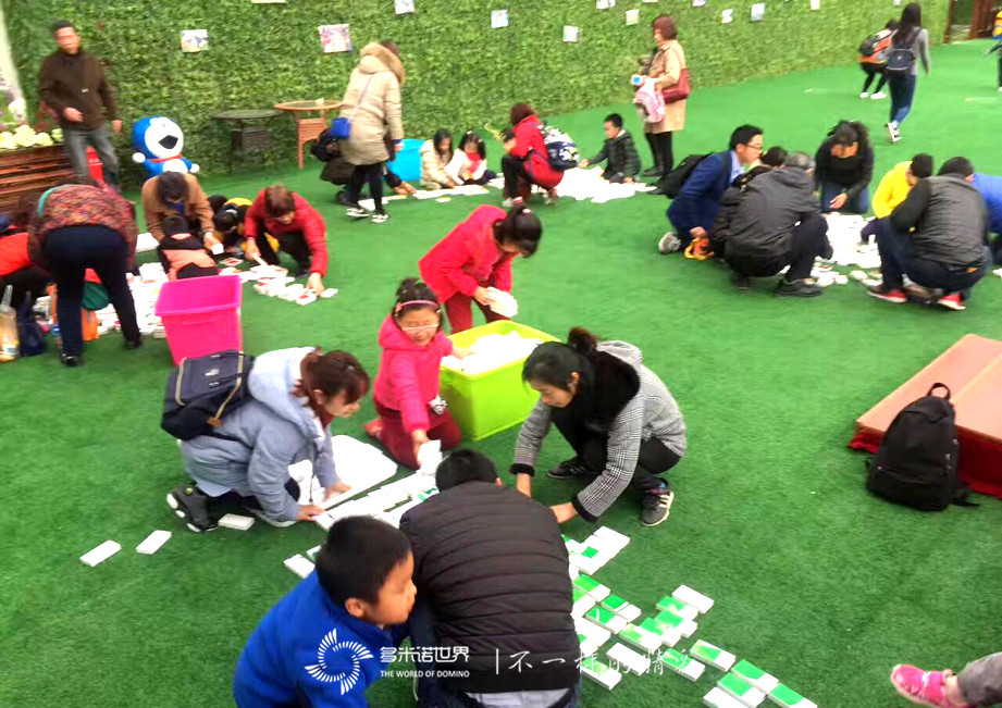 本次比赛也是亲子赛,由孩子和家长共同完成。所有家族被分别四组,每组码放一幅图案。每枚骨牌上都是图案的一部分,所以要先将骨牌像拼图一样拼出完整画面,然后再按要求完成码放,最后要做到触及一枚骨牌,图案完全呈现,才算成功。