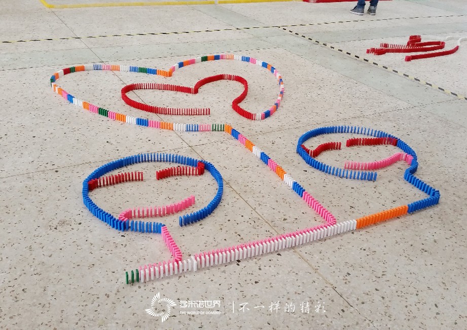 比赛分为四组,每个团队给自己的组队取了响亮的名字(雄鹰队,富强队,冲锋队,梦之队)和有力的口号,大家根据自己的队名,开始勾画着创意,不断地修改着,计算着用牌的数量,还要搭配颜色,希望把创意做到完美。这边创意的场面热闹,那边规定画面的摆放也在井然有序地开展着。对于初次参与多米诺活动的队员来说,今天的任务确实不容易,每个团队都或多或少地出现了意外倒牌的现象,但是大家没有丝毫的气馁,表现出顽强的意志,越挫越勇,最终功夫不付有心人,完成了整体图案的摆放。当最后一个连接点完成的时候,现场寂静片刻之后,大家不约而同地鼓起了掌,为自己的努力鼓掌,为团队合作的力量鼓掌,为大家的成果鼓掌。画面依次展现,所有的骨牌完美呈现,这一刻,紧张的心情得到了释放,成就感油然而生,欢呼雀跃,留下难忘的合影。