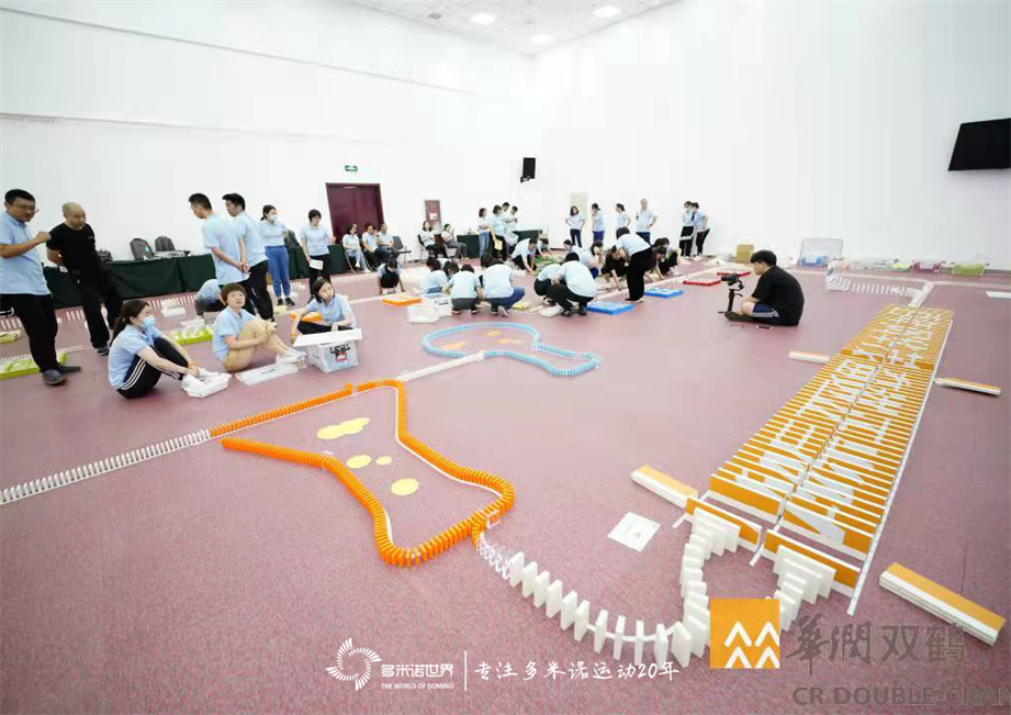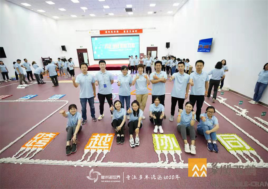 2021年9月4日,50位双鹤风华计划的伙伴相聚怀柔,共同迎来多米诺骨牌团队大挑战。在多米诺世界老师的讲解后,大家开始分组行动,绘制画面,搭建文字,机关组装和调试,每一个任务内容都在有条不紊地进行着,最终经过两个小时的搭建,骨牌画卷顺利完成。在大家的共同倒计时声中,小球成功落入轨道,触发骨牌一路前行,经过一幅幅多米诺骨牌搭建出来的画面,和一个个队员们零件创造的机关装置,最终成功展现双鹤药业标识画面,多米诺团队大挑战获得百分百成功。