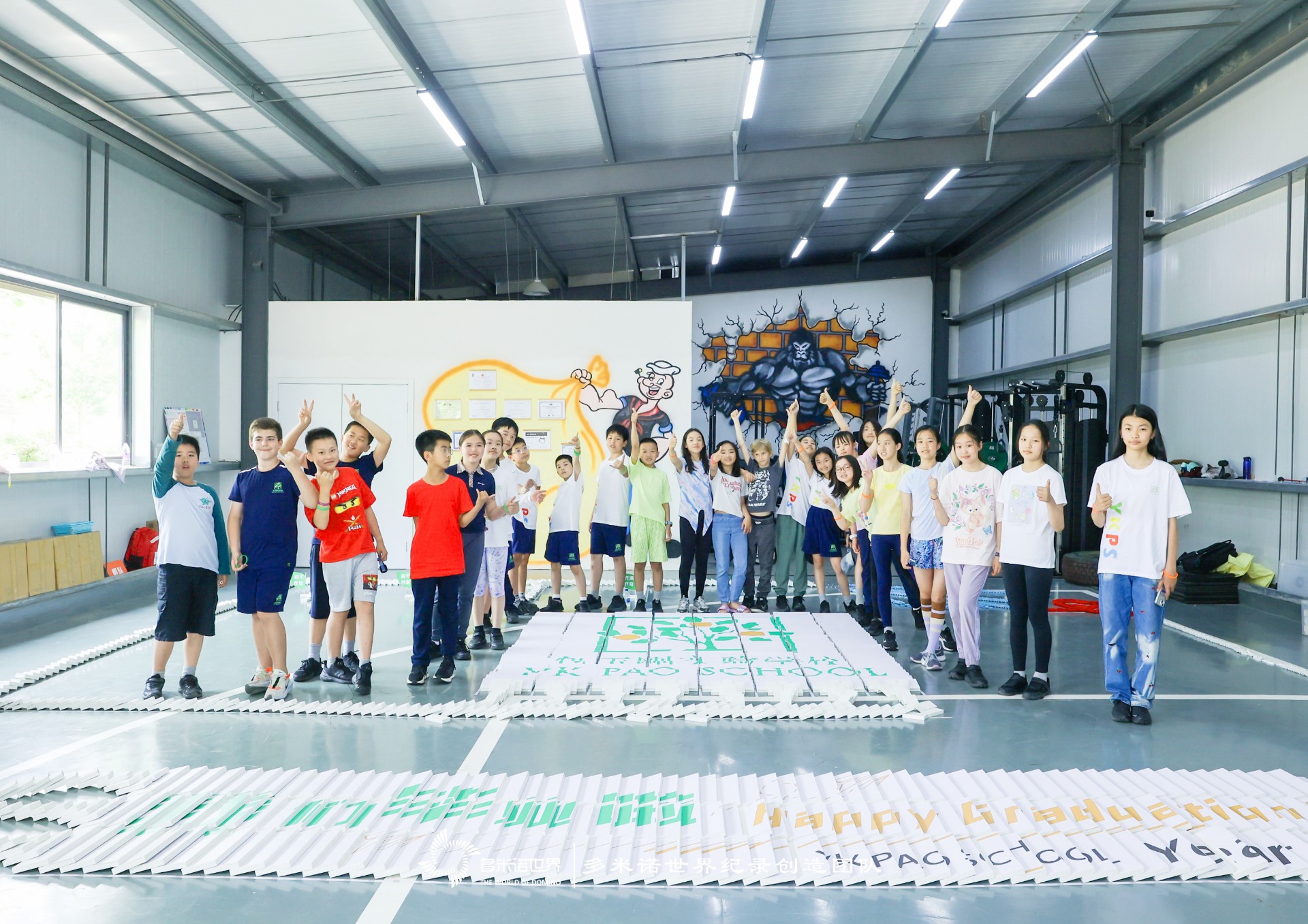 2023年5月14日,来自YK Pao School 5D班的26个孩子相聚在一起,在毕业旅行中共同完成了一幅多米诺共创作品,作为一份特殊的毕业礼物,送给自己也献给母校。