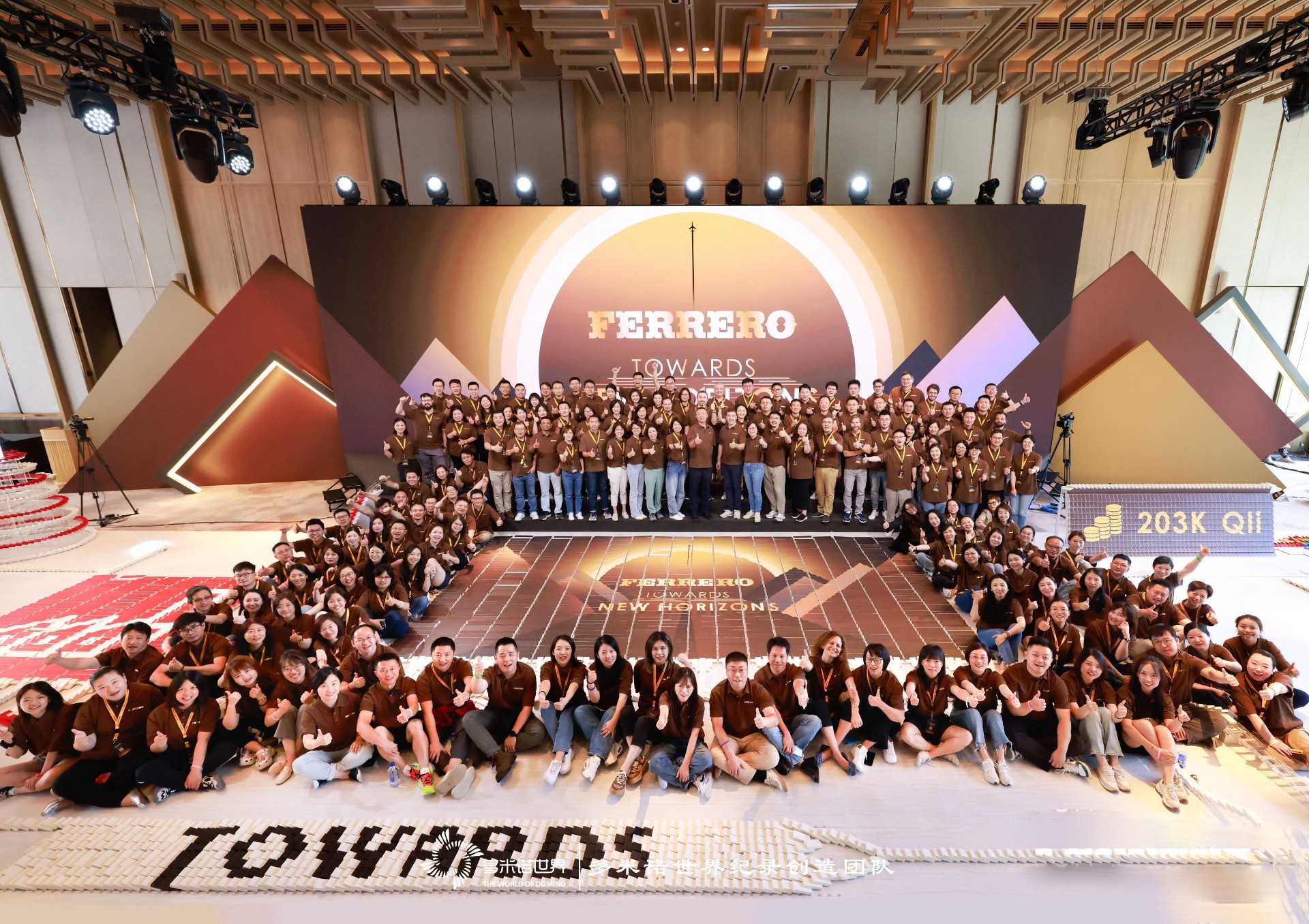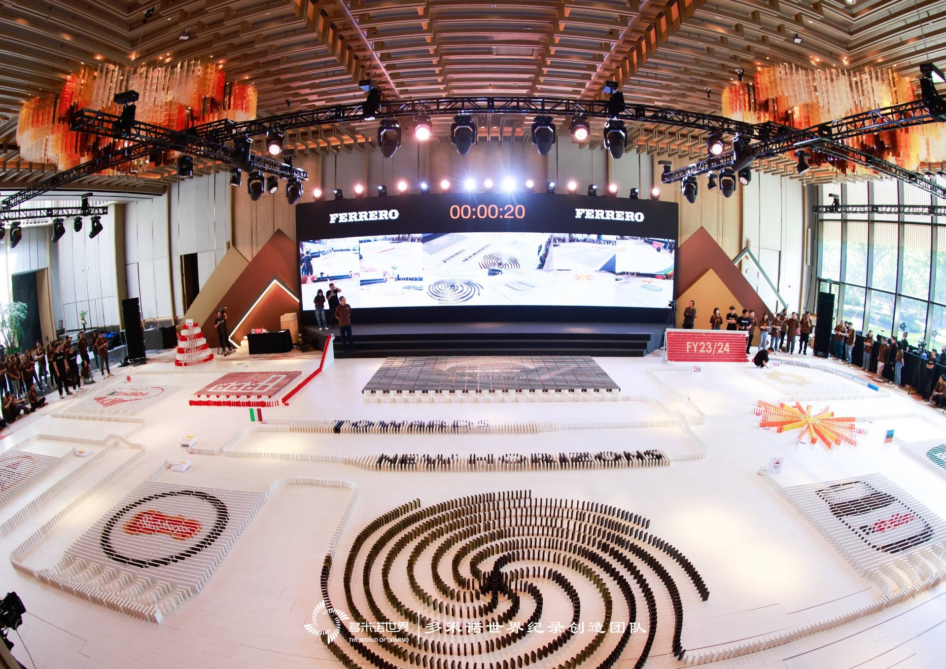 彩色的多米诺骨牌排列形成各种图案和形状,经过两个小时的努力,一幅巨大多米诺作品完成。在全场共同倒计时声中,嘉宾触发一枚费列罗巧克力,随之联动骨牌顺利行进,骨牌呈现出的画面变得栩栩如生,产品的轮廓和细节跃然于眼前。随着骨牌画面的依次呈现,为伙伴们带来了无尽的惊喜和愉悦,这些大家亲身体验,共同努力创造出来的成果,看起来尤为亲切,在收获成功喜悦的同时,在共创过程中更拉近了伙伴间的距离。