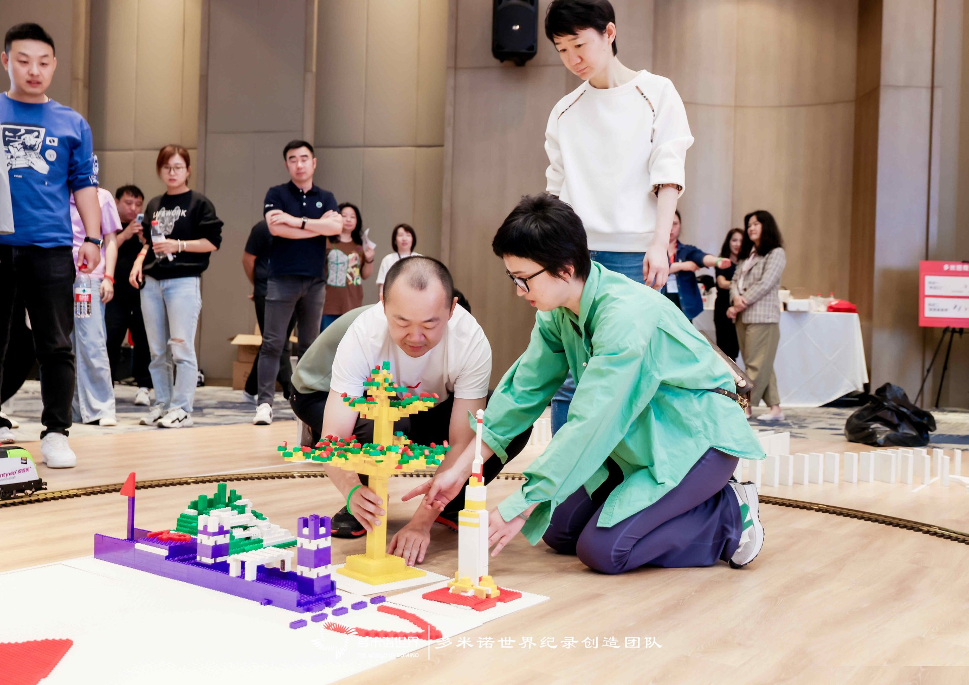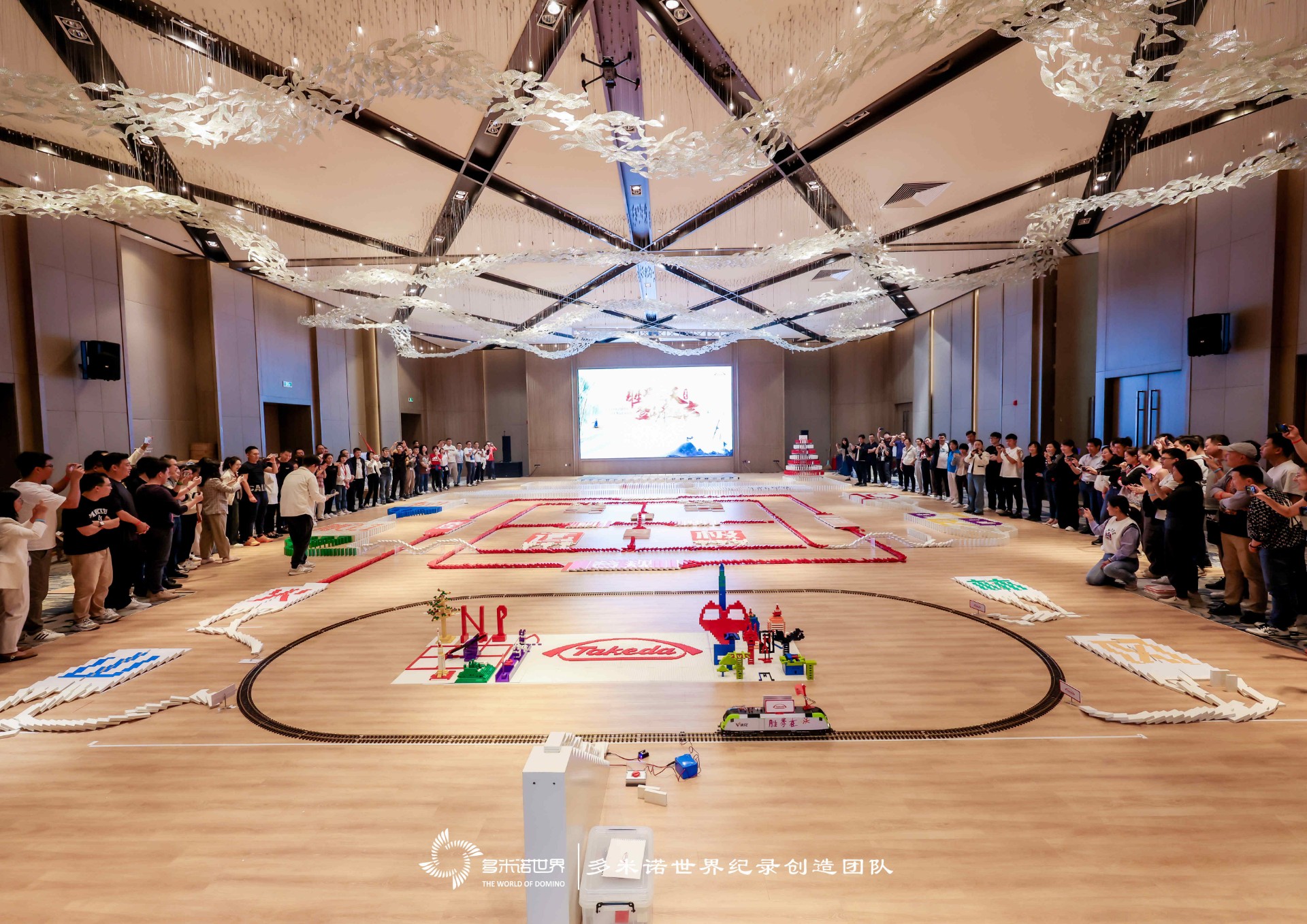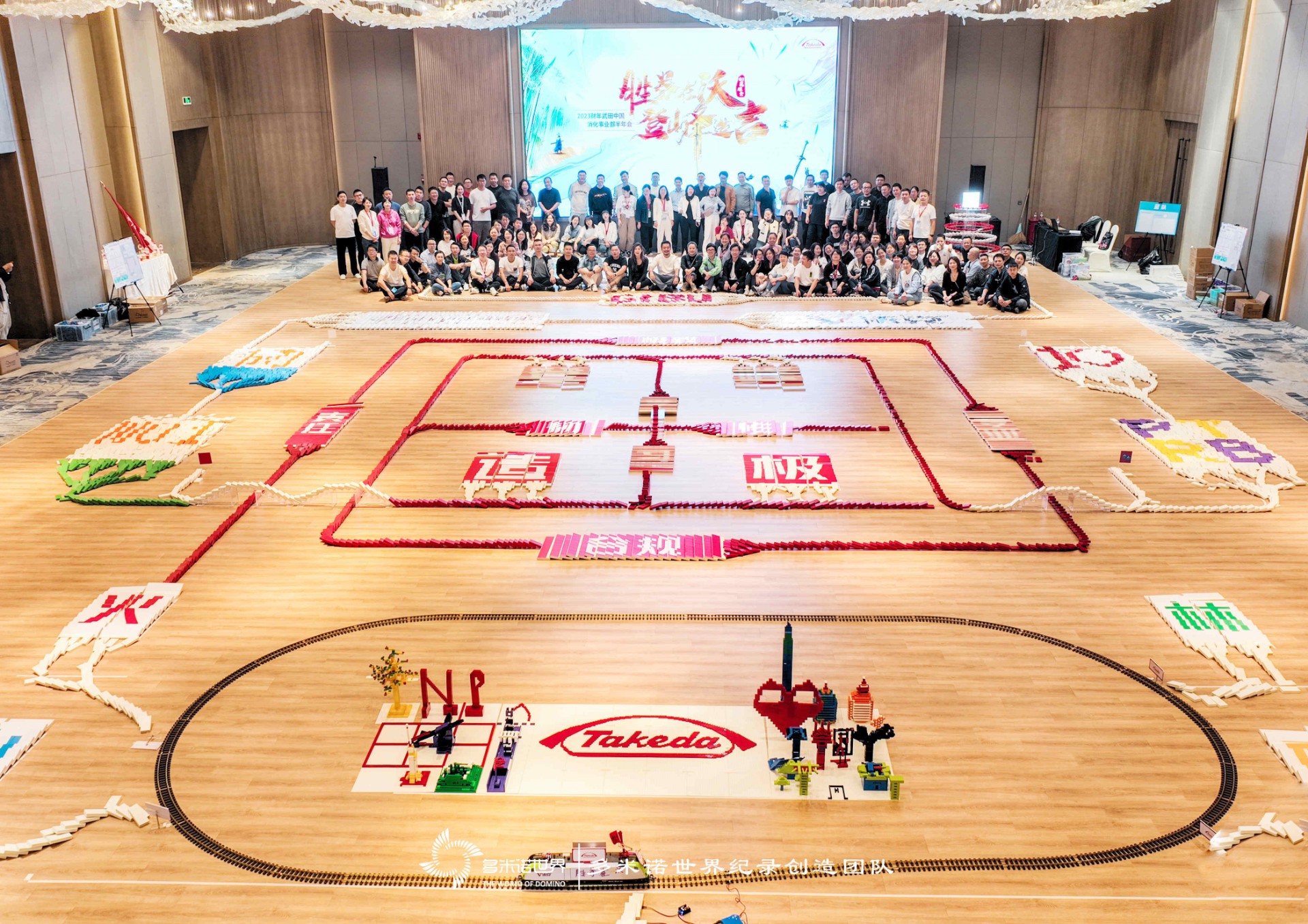 在短短2个小时内完成了多米诺骨牌主题画面的搭建,创意拼搭,并特别设计了“武田号“动力火车,与多米诺骨牌巧妙地连接在一起,展现公司的企业文化和年会主题,随着动力火车的行驶,第一枚骨牌被触碰开启,一个小小的力量传递到全局,收获百分百的成功。