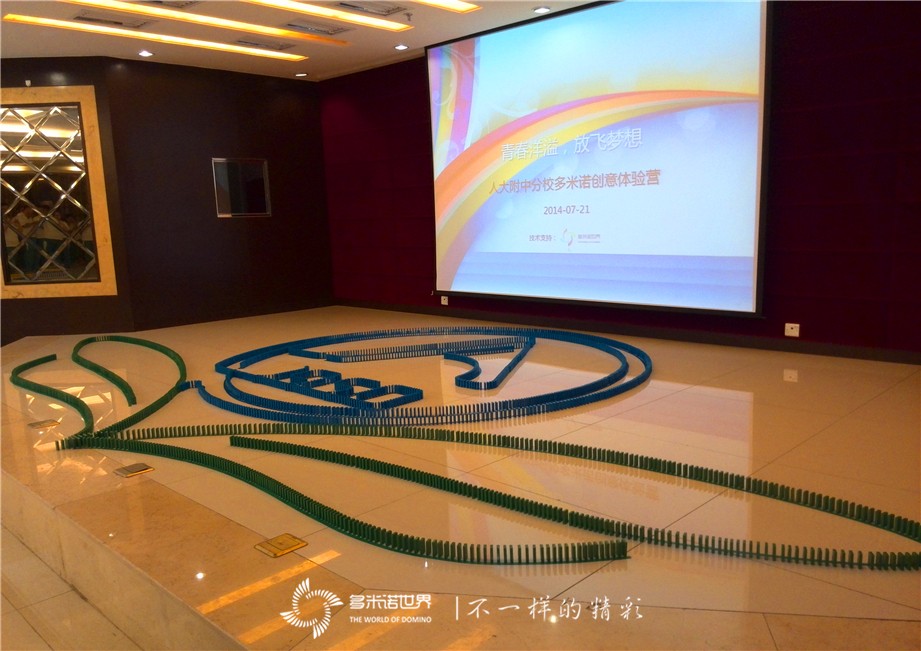 2014年7月21日,80余名人大附中学生干部来到风景秀丽的十渡风景区,参加一年一度的夏令营活动。今年的夏令营,老师特别邀请了“多米诺世界”团队,为同学们带来了多米诺挑战活动。大家在3个小时的时间里,充分体验到了多米诺的无穷乐趣,了解了多米诺文化,并通过团队的智慧和努力,创意出一幅幅精彩的多米诺作品。