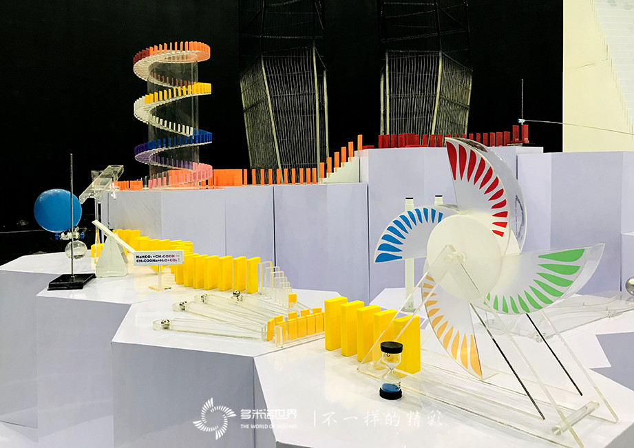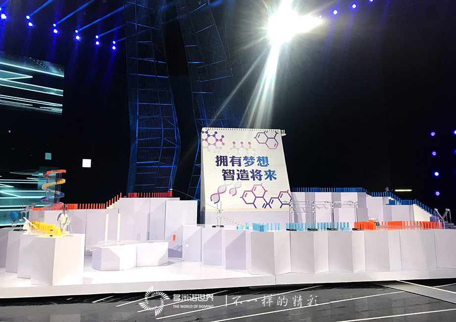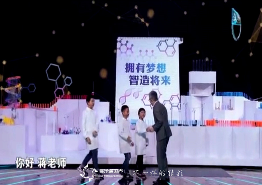2019年2月17日晚,新一期公益性科技综艺节目《智造将来》如期播出。第一个科技项目,三位可爱的小朋友到来舞台上,向大家介绍化学反应,随后主持人蒋昌建启动了由多米诺世界团队完成的多米诺骨牌阵,多米诺大风车转动,在多米诺骨牌的行进过程中,一个个化学反应实验展现在所有观众面前,引起现场的阵阵掌声与惊呼声。