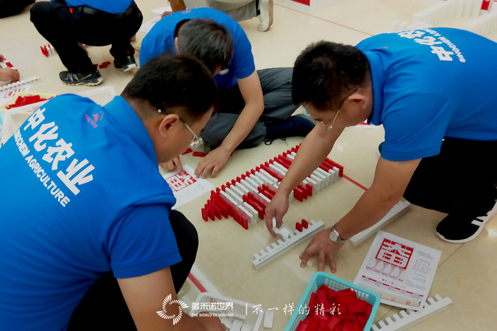 冲过重重考验,获得多米诺资源后,各组组长带领大家进入各组区域,完成本队任务,共建“中化农业红旗渠”。场地内,有认真投入码放多米诺骨牌的,有开动脑筋组装乐高图案的,有创意无限用各种道具组建多米诺戈德堡的,还有不惧失败调整机器人启动装置的;所有队员都在专注于自己的任务,各司其职又默契配合,活动现场气氛如火如荼、士气高涨。
