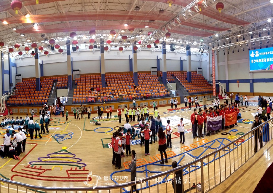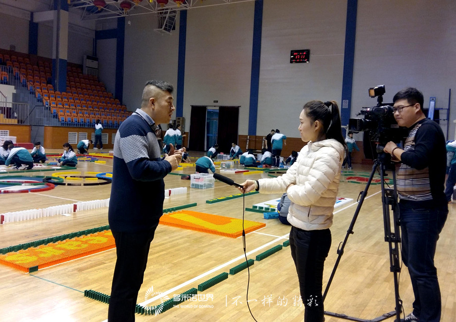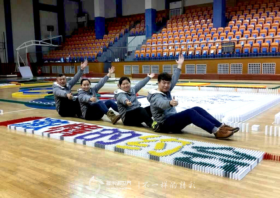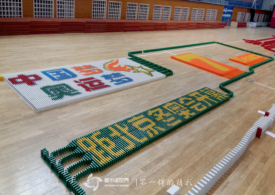 在所有师生的共同努力下,不到两天的时间,11余万枚骨牌稳稳站立在了场地中,精美的多米诺画卷展现在大家面前。