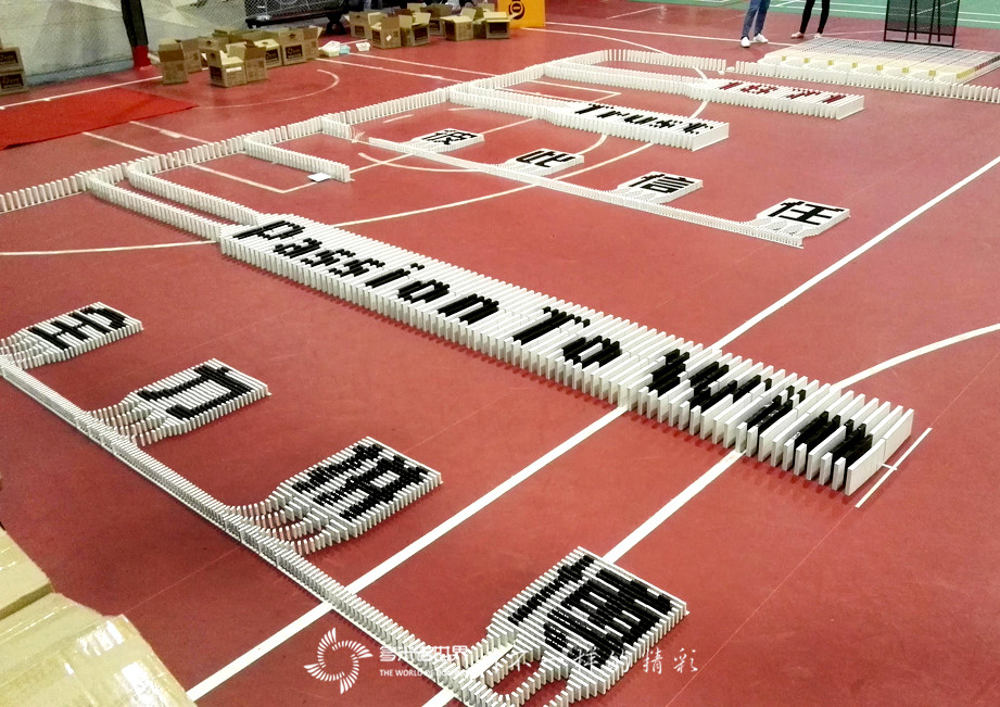 本次挑战方案设计,以德国国旗为起始,以中国国旗为结束,中间串起了大陆公司的核心价值观,活动主题词、大陆LOGO等内容。为了更好的展现图案效果,本次活动更多的使用了特制大骨牌,以及标准多米诺图案,增加了整场活动的强度和难度。