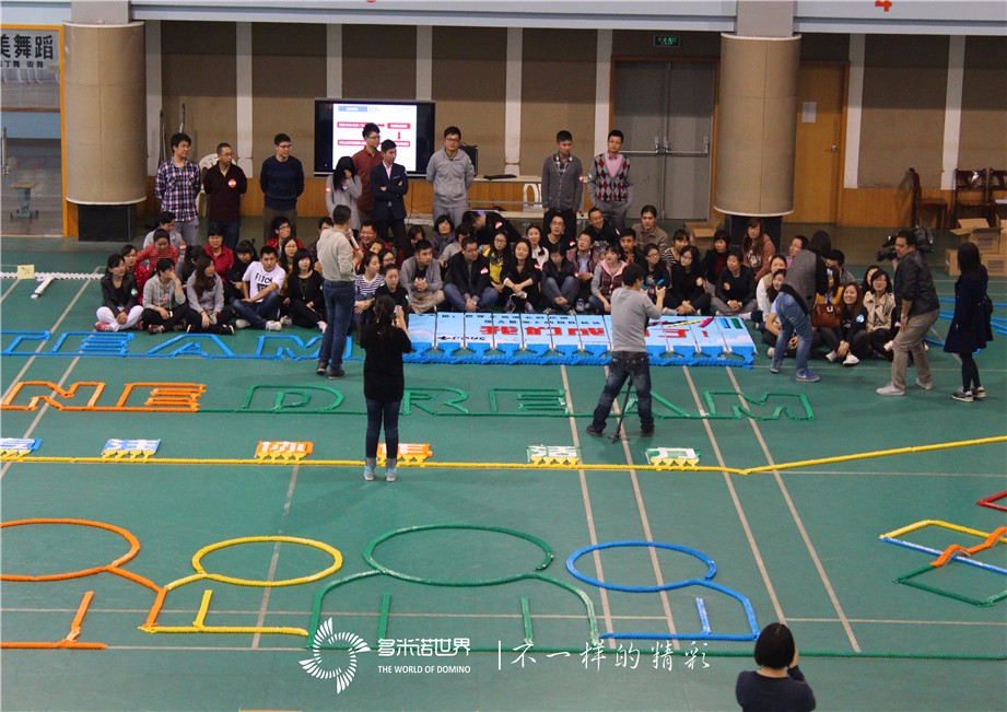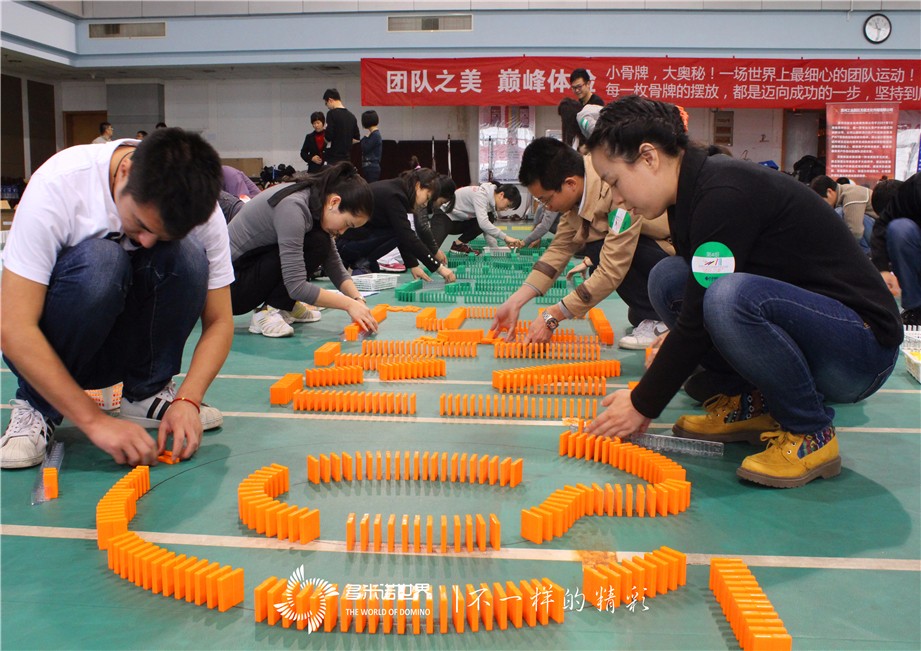6个小时,80名队员,40000枚骨牌在苏州电视媒体的见证下,由外名团队代表共同启动,骨牌由一个“多彩中国结”开始,经过“团队心连心”立下“胜利的希望”用“执着、专注、协作、活力”共同将“梦想启程”高举“胜利的旗帜”在“One Team One Dream”的口号声中欢庆“我们成功了!”